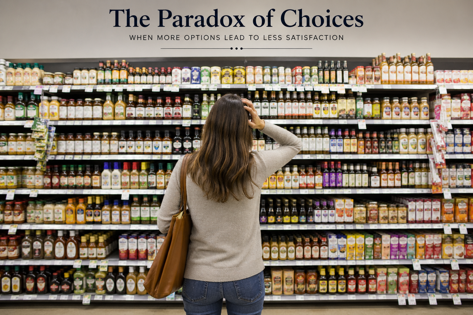 Picture this: You walk into a grocery store looking for jam. Instead of the three or four varieties you expected, you're confronted with 24 different options. Strawberry, raspberry, blueberry, mixed berry, organic, sugar-free, artisanal, imported... The shelves blur together. Ten minutes later, you walk out empty-handed, overwhelmed and strangely exhausted. This isn't just about jam. This is about one of the most counterintuitive findings in modern psychology: more choice can actually make us less happy. The Jam Study That Changed Everything In 2000, psychologists Sheena Iyengar and Mark Lepper conducted what would become one of the most famous experiments in behavioral science. They set up a tasting booth in a California grocery store, alternating between displaying 24 varieties of jam and just 6 varieties. The results were striking. While the larger display attracted more attention (60% of shoppers stopped to look versus 40% for the smaller display), the smaller selection led to dramatically more purchases. Only 3% of people who